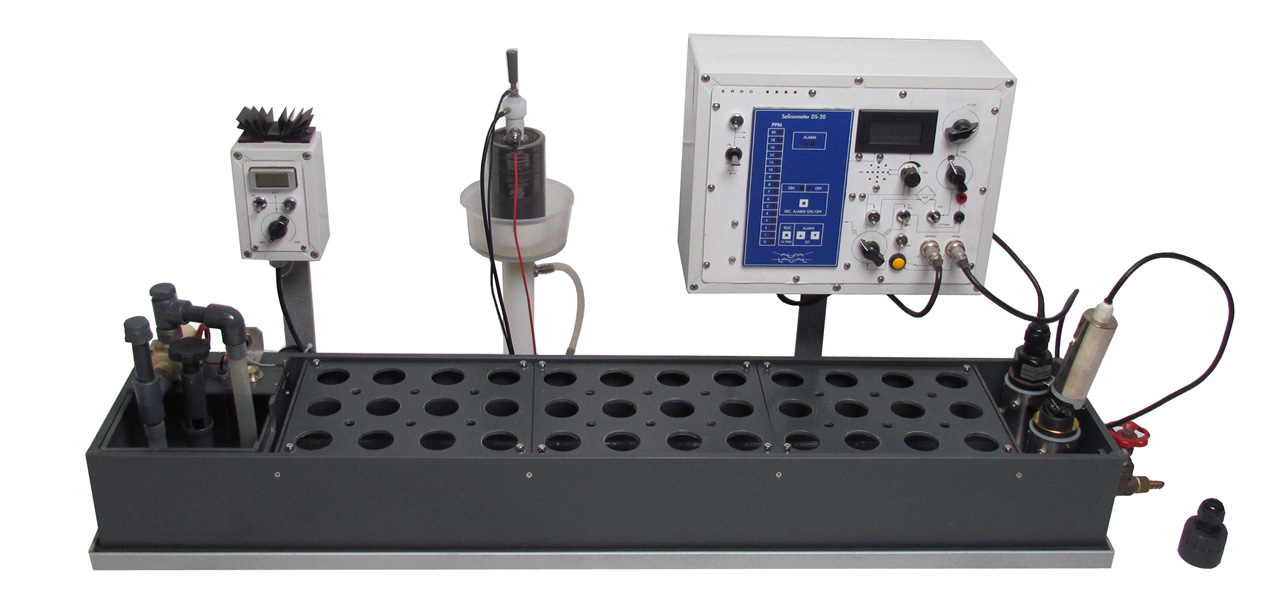 L'apparecchio di test delle sonde per salinometro è composto da una vasca contenente acqua demineralizzata che viene posta in scorrimento continuo mediante una pompa situata sul lato sinistro. All’estremità destra della vasca è invece installata la stazione di lettura dove si verifica che le sonde non abbiano difetti e funzionino correttamente. L'apparecchio è infine corredato da un dializzatore elettrolitico che viene utilizzato per stabilizzare la concentrazione di sale nell'acqua ad un valore di circa 10 ppm.